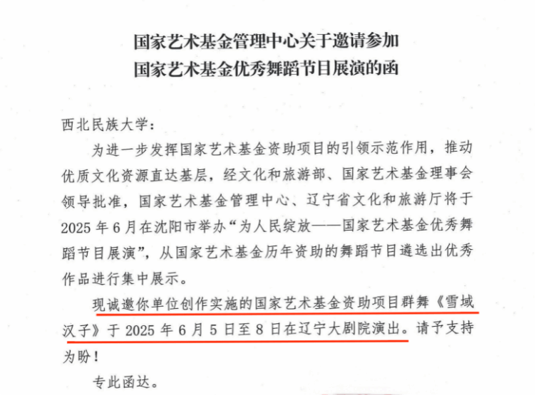 近日,学校舞蹈学院原创作品《雪域汉子》历经严格遴选,成功入选由国家艺术基金管理中心与辽宁省文化和旅游厅联合主办的“为人民绽放——国家艺术基金优秀舞蹈节目展演”,该作品也是甘肃省唯一入选本次展演的舞蹈作品。